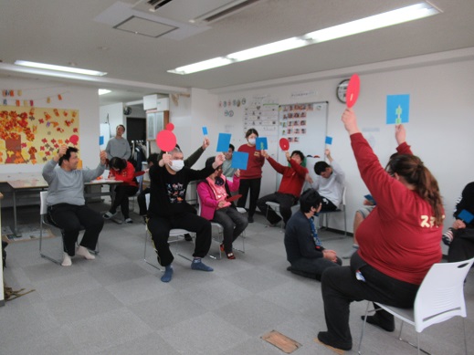 レクリエーションの時間ではボール投げと二色の旗を使った旗揚げゲームを行いました🚩最初はスタッフの動きを見てから旗を上げていたメンバーさんですが、次第にスタッフの掛け声をよく聞いて音声だけの指示でも旗を上げられるようになっていました🙌🌟