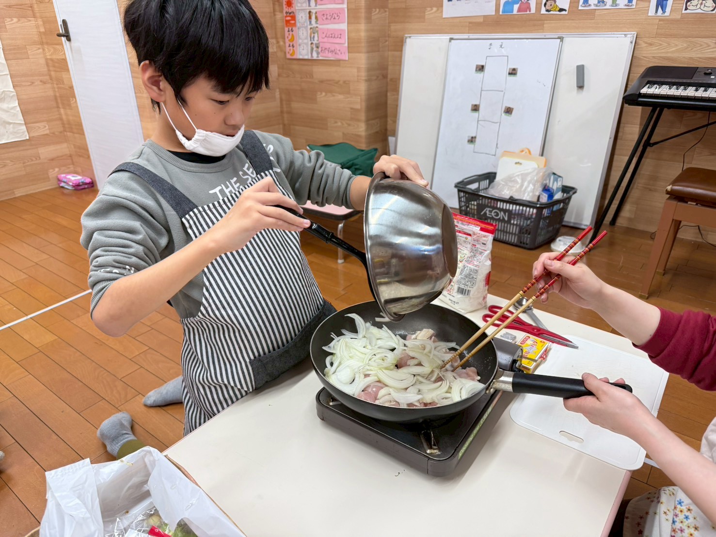 グラタンを作りました☆ 2025.12.02 2025.12.01 みんなでクッキングに参加し 玉ねぎは、目にしみるけど、頑張って最後まで切れました。「美味しくな~れ」とみんなで唱えながら具材を混ぜて上手に出来ました❗