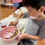 初めて作るとドキドキしながら作る子もいました!唐揚げ担当、ひじき担当など皆で分担して進めていきました。