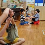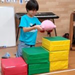 皆で輪になり、リトミックをしたり、音楽に合わせて身体を動かしたりしました。また、『うみ』の曲に合わせてマラカスを鳴らしリズム打ちをしたり、ドレミ階段でぬいぐるみを動かしたりと今月も盛りだくさんでした♪