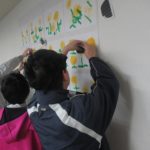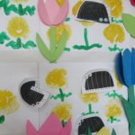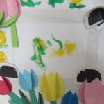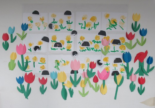 たんぽぽは布と絵の具を使ったスタンプで、チューリップは画用紙を切ったり折ったりして立体的に作られています!
